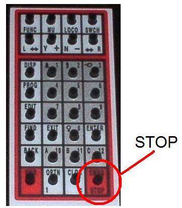 Press the EMRG STOP Key to stop the loco that is active in the throttle display. To resume operation, use the throttle knob associated with that address to increase the loco’s speed.